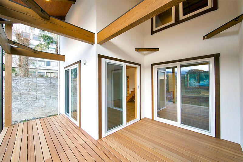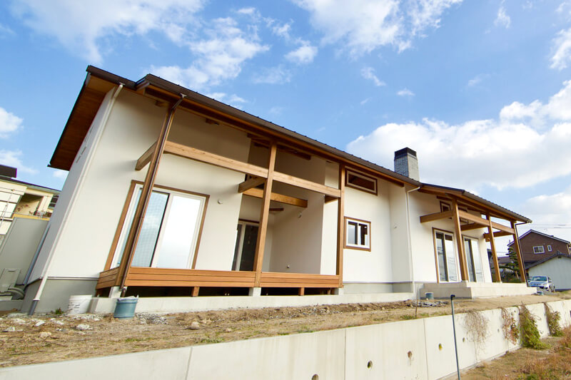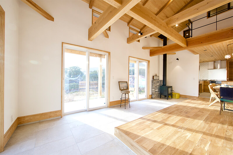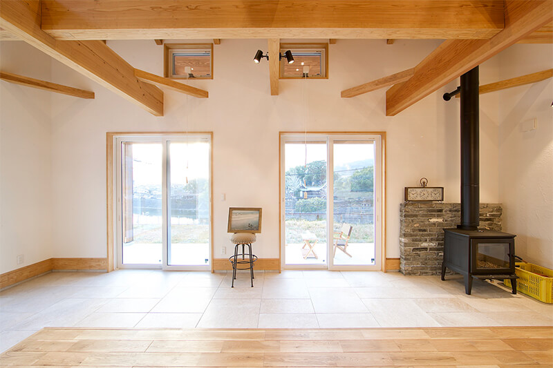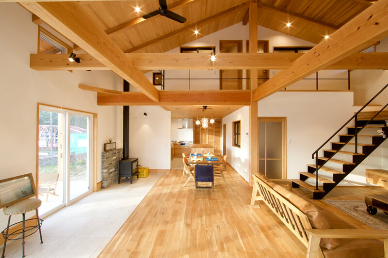 高台に建つ中二階の木の家は、テラス窓から青空を望み、薪ストーブが温もりを添える心地よい住まい。広々としたデッキから川上橋を一望でき、白い塗り壁や木枠が自然と調和します。玄関から土間リビングへと続く配置は家族の気配を感じられ、薪ストーブを囲んで団欒を楽しめるアットホームな空間に。開放感ある間取りと勾配天井が奥行きを生み、自然と共に穏やかな日常を過ごせます。