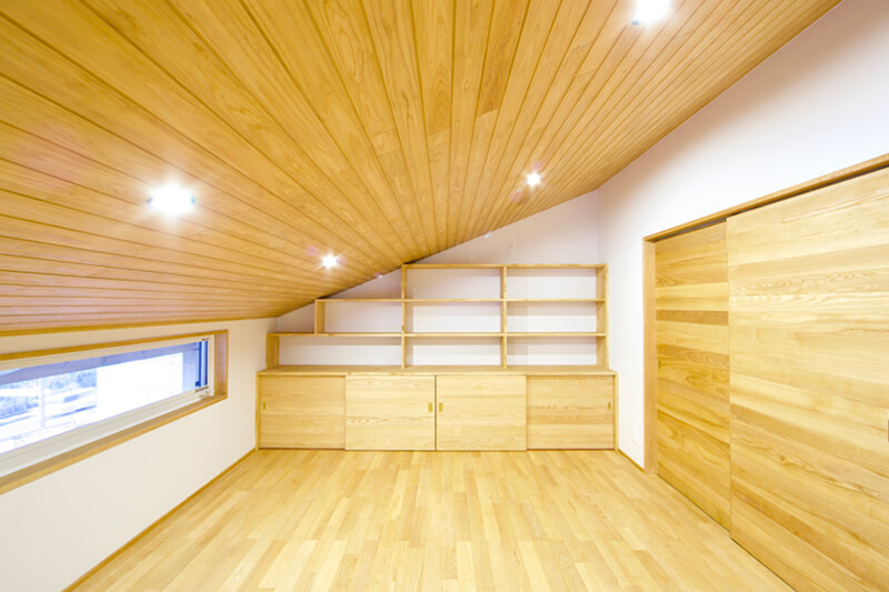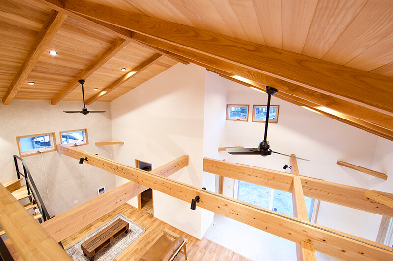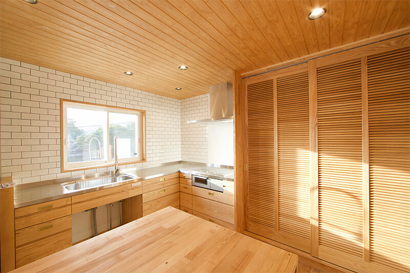 内装は杉の無垢材と真っ白な再生紙を壁に用い、明るく温もりある雰囲気に。建具や家具、ダイニングテーブルも大工の手作りで、自然乾燥させた材木を吟味して使用。外壁には杉板を張り、構造材を美しく見せながら適材適所に配置しています。